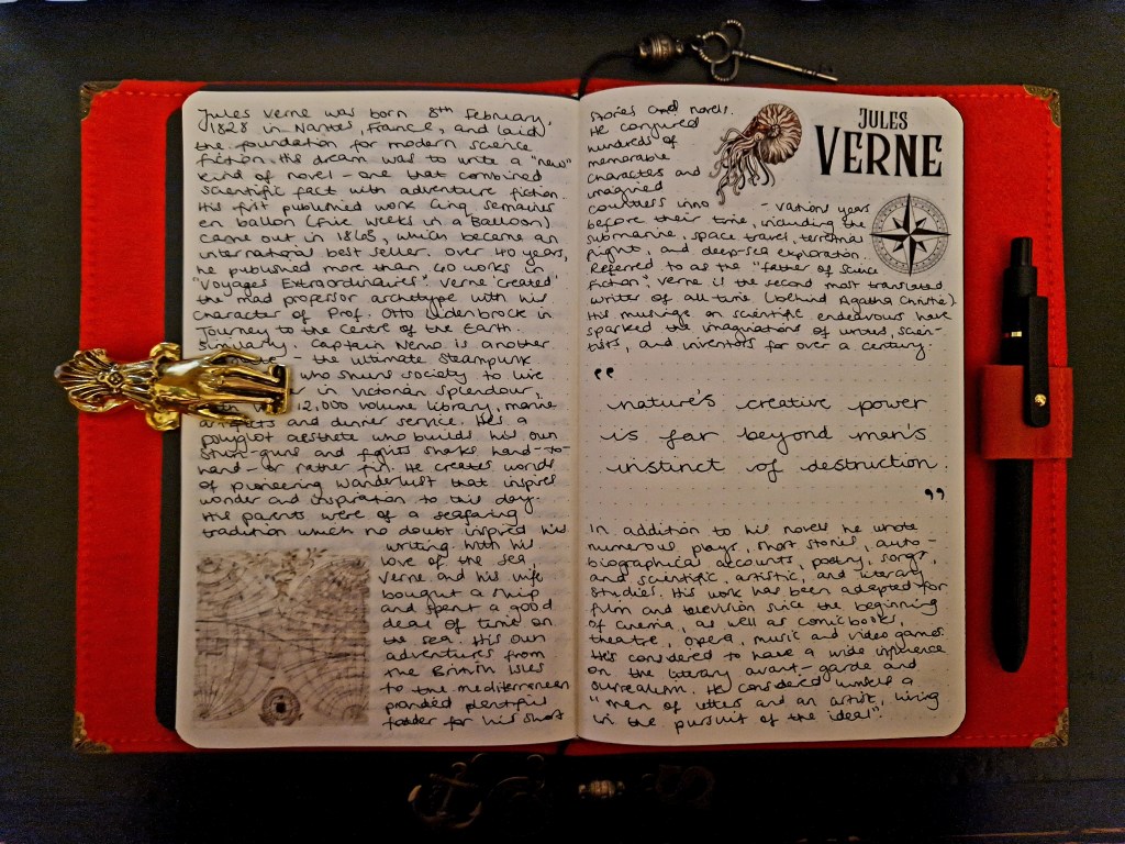 The third is my favourite, and it’s called INSPIRATION. This is the insert you can see below. It’s where I have fun making the page look beautiful and I write about anything and everything that inspires me. I even make the stickers myself so that it’s exactly what I want. Below you’ll see I’ve written about science fiction MASTER Jules Verne – one of my favourites, The Vampire – a supernatural obsession that started when I was just a tot, and The Bard himself, my absolute favourite wordsmith of all time. But I’ve also written about favourite books and TV shows, zombies, botany, the wives of literary authors and how their diaries were used for their husband’s careers, ancient navigation, and the darkness. It’s a broad scope and a place for me to honour and hone in on the things I’m really passionate about.